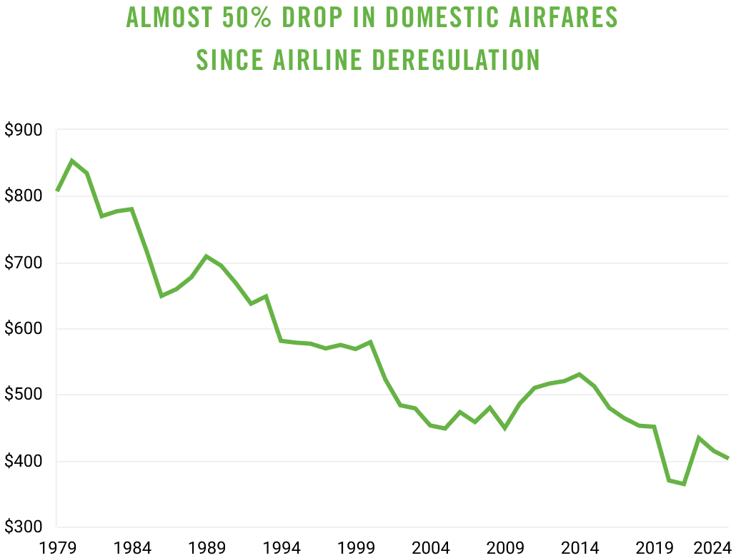 Since airline industry deregulation in 1978, domestic fares have dropped nearly 50 percent (adjusted for inflation, including fees), and now passengers have more choices than ever.