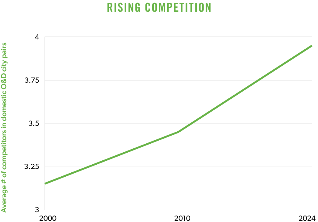 From 2000 – 2024, the number of competitors per domestic air trip rose, as did passenger access to lower-cost carriers. In 2021, for example, two new low-cost airlines entered the U.S. air-travel marketplace.